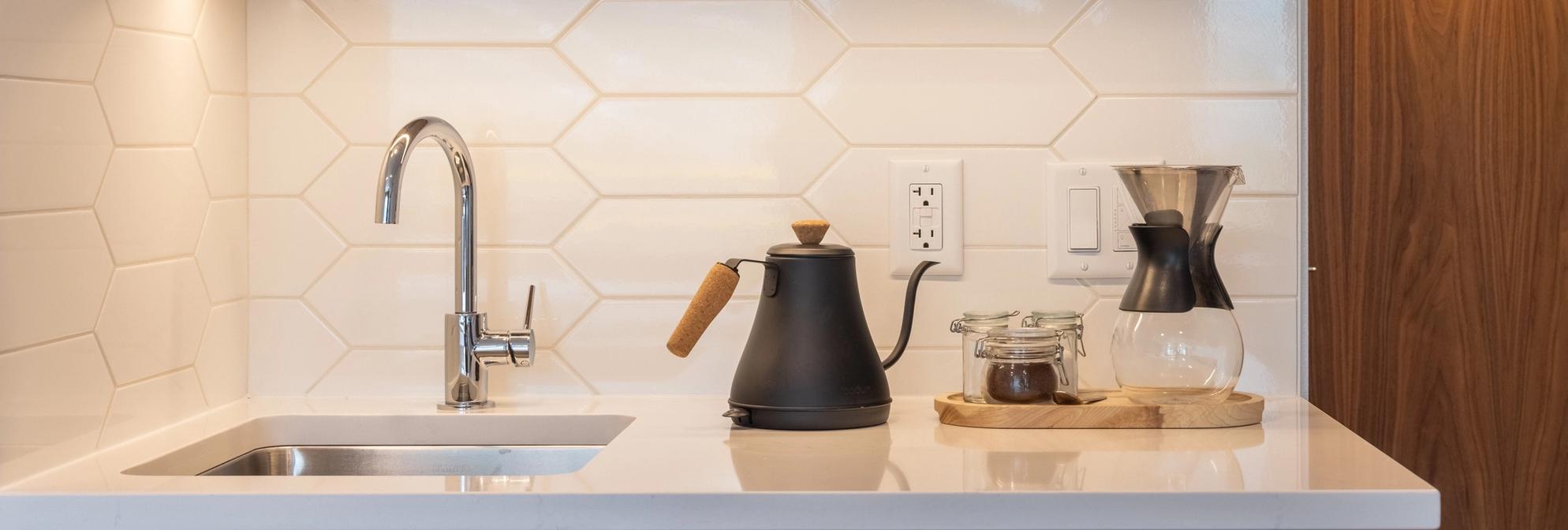 This experience gets even better when the guest arrives at their hotel room. A pristine kettle, ceramic mugs, and a pour-over are set up ready for use. There’s even a small compost container for coffee grounds and tea leaves, completing the sustainable experience.